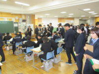 本日は、1年1組で「新聞スクラップから見つけた職業から、自分の興味・関心を見つけよう」を題材に、授業を行いました。生徒は、スクラップした新聞記事から記事に関する職業を探しました。次に自分の記事から見つけた職業を5つ以内選び、それぞれの職業観を考え、共通点を見つけ、互いの意見を交換しました。