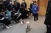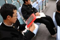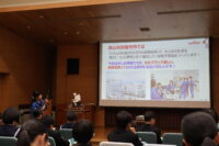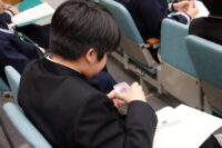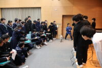 私たちの生活にある身近な製品の電子部品を作っている仕事の内容について、クイズを交えながら学びました。また、ロボットのムラタセイサク君を実際に操作していただき、生徒からは「すごい!」「面白い!」と、様々な声が上がっていました。
