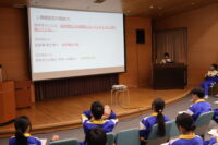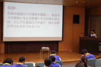 3年生の総合的な学習の時間では、「共に生きる ~SDGs 私たちにできること~」をテーマにし、個人で計画を立て、調査活動を行ってきました。今日は、学年で選ばれた8人の生徒が調査活動のまとめを発表しました。実際に現地に足を運んで調査をしたり、仮説が正しいかを家庭で実践し検証したりするなど、発表者1人1人の活動に工夫が感じられました。