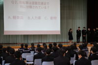 生徒集会では、生活委員会や生徒会執行部からクイズや劇を通して冬休みの生活習慣や交通安全について注意点を確認しました。また、全校合唱では、「空も飛べるはず」を全校で合唱し、素晴らしい歌声が響きました。