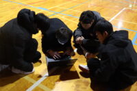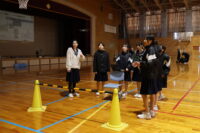 パソコンでプログラムを組み、ドローンを操作しました。ドローンがフラフープの中を通ったり、椅子の上に着地したり、ポールの下をくぐり抜けたりできるよう、試行錯誤を重ねていました。思い通りに操作できた時は、歓声が上がっていました。