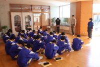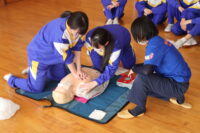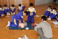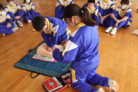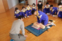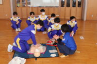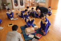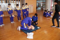 南砺消防署から2名の講師をお招きし、保健体育の授業で心肺蘇生法の実習を行いました。周囲の確認、119番通報、AEDの手配の流れを確認しました。